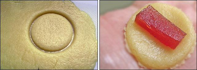 Para a montagem: corte pequenos círculos ( eu usei uma xícara de café), coloque um pedacinho de goiabada no meio e feche.